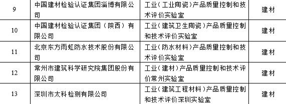 其中,建材行業(yè)共有5家入選,這5家實驗室涉及工業(yè)陶瓷、建筑衛(wèi)生陶瓷、防水材料等領(lǐng)域,分別為中國建材檢驗認證集團淄博有限公司工業(yè)(工業(yè)陶瓷)產(chǎn)品質(zhì)量控制和技術(shù)評價實驗室、中國建材檢驗認證集團(陜西)有限公司工業(yè)(建筑衛(wèi)生陶瓷)產(chǎn)品質(zhì)量控制和技術(shù)評價實驗室、北京東方雨虹防水技術(shù)股份有限公司工業(yè)(防水材料)產(chǎn)品質(zhì)量控制和技術(shù)評價實驗室、常州市建筑科學(xué)研究院集團股份有限公司工業(yè)(建材)產(chǎn)品質(zhì)量控制和技術(shù)評價常州實驗室、深圳市太科檢測有限公司工業(yè)(建筑工程材料)產(chǎn)品質(zhì)量控制和技術(shù)評價深圳實驗室。